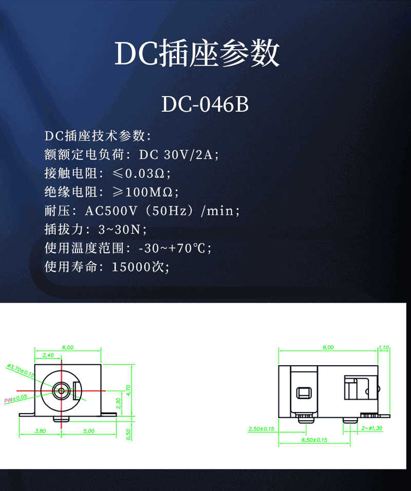產(chǎn)品簡介:此款DC插座是帶定位柱的電源插座,額定電負荷:DC 30V/2A;接觸電阻:≤0.03Ω;絕緣電阻:≥100MΩ;耐壓:AC500V/min;插拔力:3~30N
