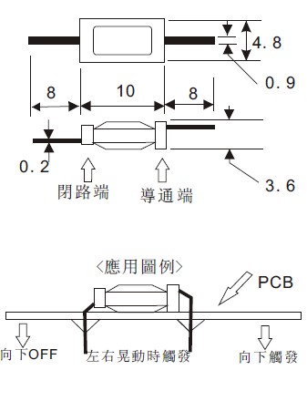 為閉路ON狀態,當產品處於水平狀態,為開路OFF